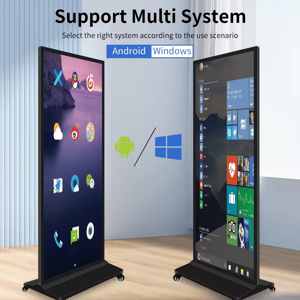 మా ఇండోర్ ఫ్లోర్ స్టాండింగ్ అడ్వర్టైజింగ్ ప్లేయర్ దాని ఐఫోన్ ఆకారంలో ఉన్న టోటెమ్ కియోస్క్ డిజైన్తో ఒక ప్రకటన చేయడానికి రూపొందించబడింది, ఇది ఏ ఇండోర్ వాతావరణంలోనైనా నిలుస్తుంది. 32 నుండి 85 అంగుళాల వరకు పరిమాణాలలో లభిస్తుంది, మా ప్లేయర్ మీ నిర్దిష్ట అవసరాలకు అనుగుణంగా బహుముఖ ప్రజ్ఞ మరియు వశ్యతను అందిస్తుంది.